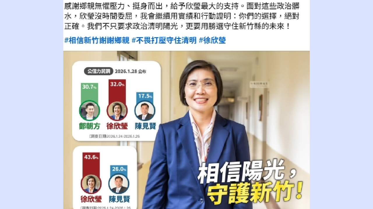 民調始終領先的徐欣瑩強調,這不僅是對黨內民主機制的踐踏,更是對新竹縣廣大民意的公然羞辱。徐欣瑩鄭重宣示:若黨中央執意護航特定人選,無視新竹民意,將堅持與縣民同行,將最終的決定權交由全體縣民決定。