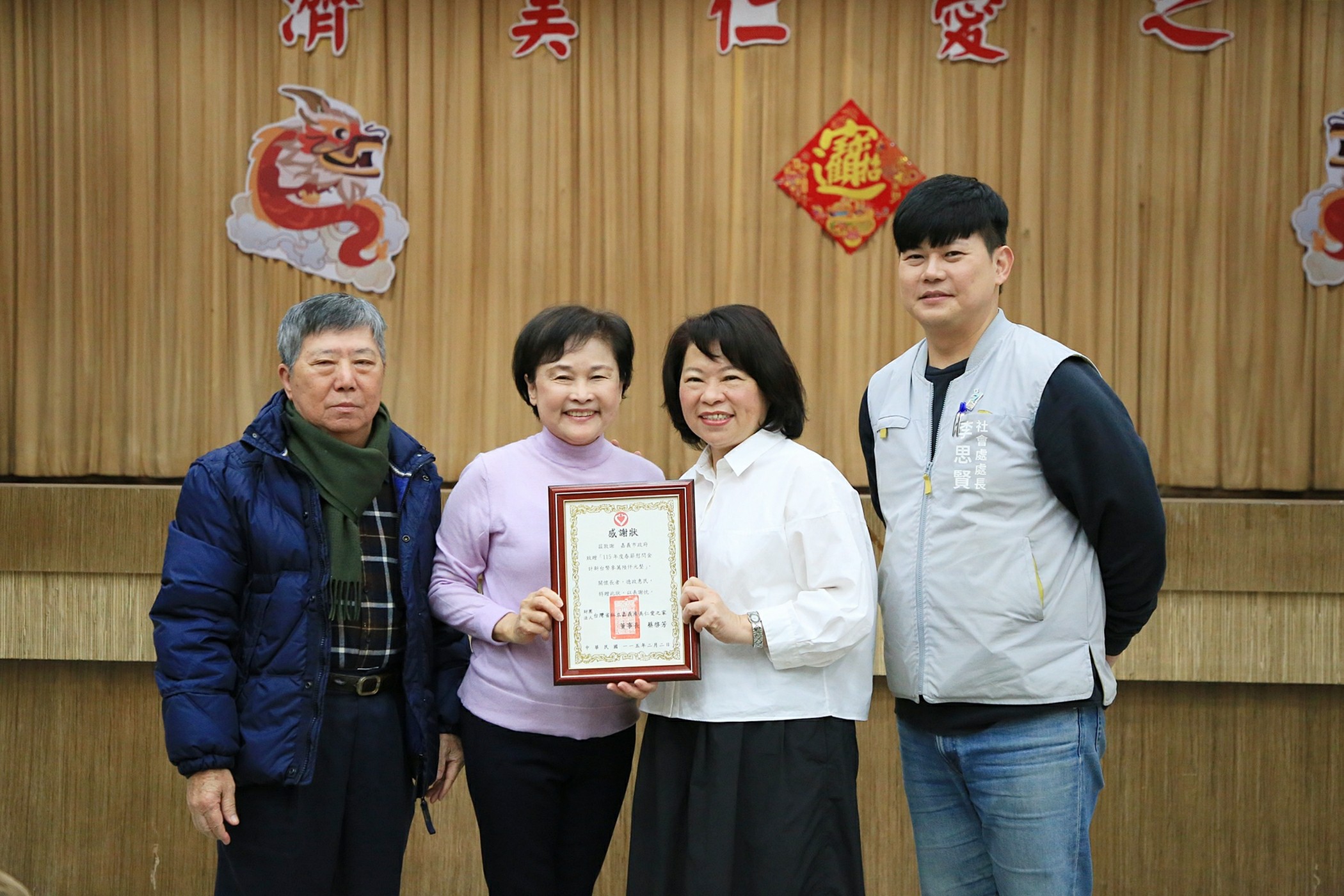 ↑圖說:嘉義市長黃敏惠前往嘉義濟美仁愛之家致贈慰問金與春節紅包,院方回贈感謝狀。(圖片來源:嘉義市社會處提供)