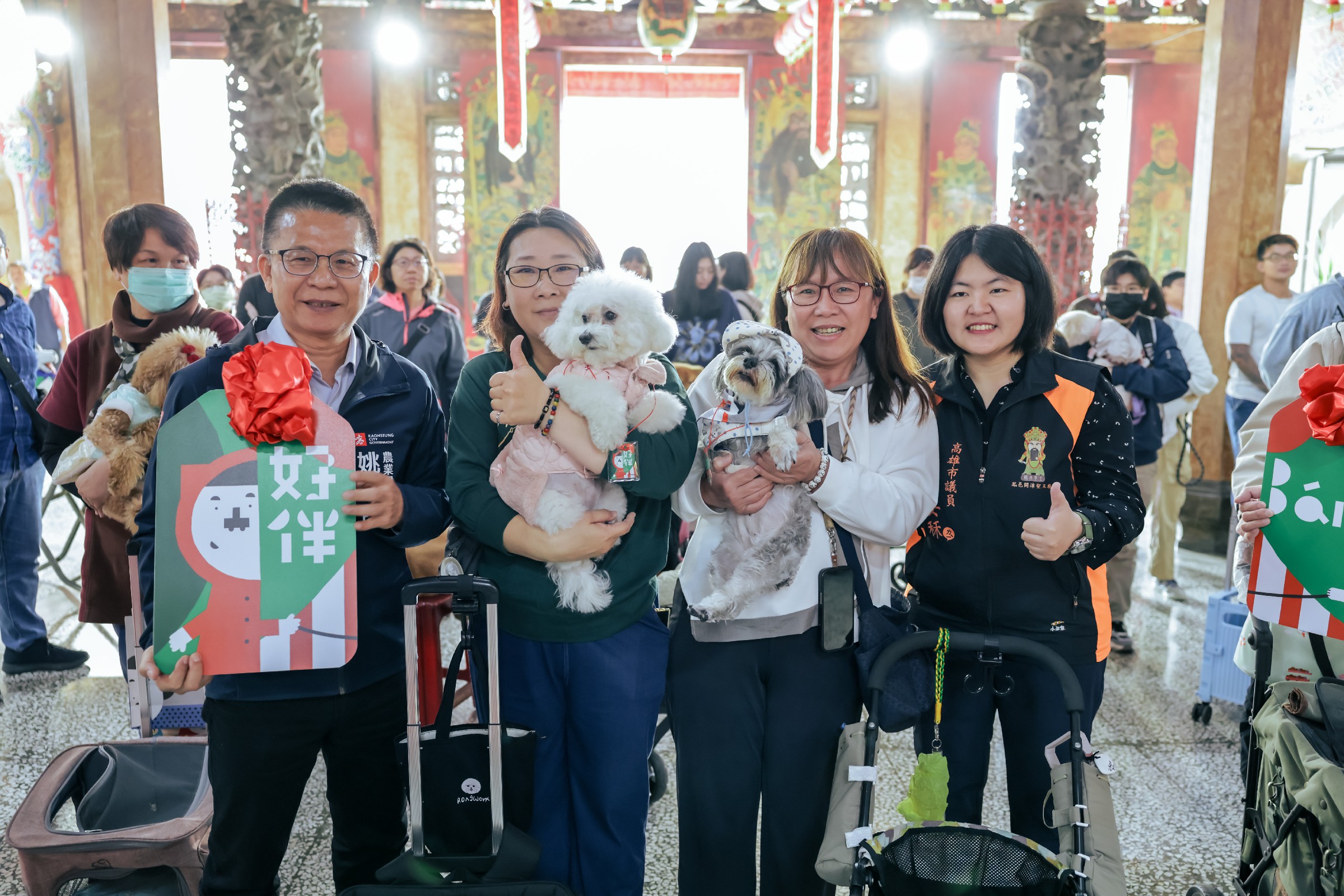 ↑圖說:鳳邑開漳聖王廟管理委員會主任委員鄭安秝(右1)、高雄市政府農業局長姚志旺(左1)發送好伴平安符與毛寶貝並與飼主合影。(圖片來源:高雄市動保處提供)