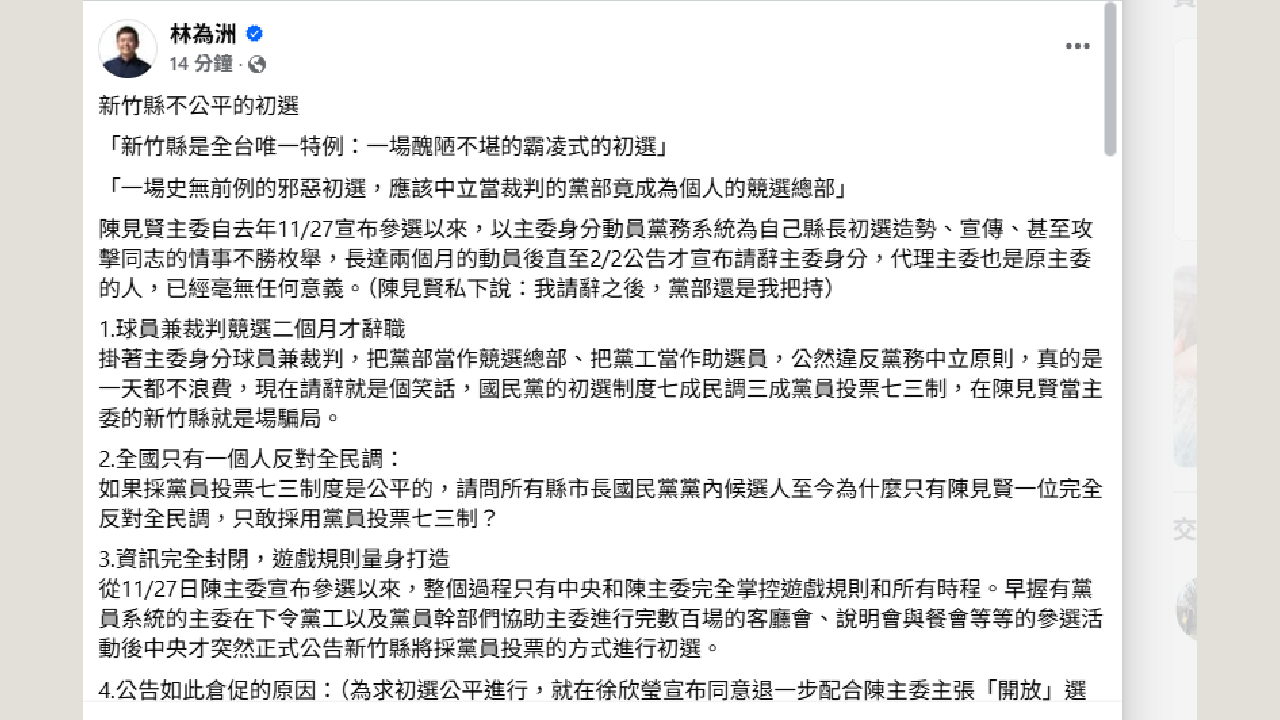 國民黨新竹縣長初選爭議持續延燒,國民黨籍前立委林為洲今日(4日)在臉書發文,公開質疑新竹縣的初選 「新竹縣是全台唯一特例:一場醜陋不堪的霸凌式的初選」、 「一場史無前例的邪惡初選,應該中立當裁判的黨部竟成為個人的競選總部」等重話形容整體過程,引發各界關注。林為洲直指,新竹縣此次初選機制在制度設計、時程公告與黨務動員上均高度失衡,已嚴重違背黨務中立與公平競爭原則。