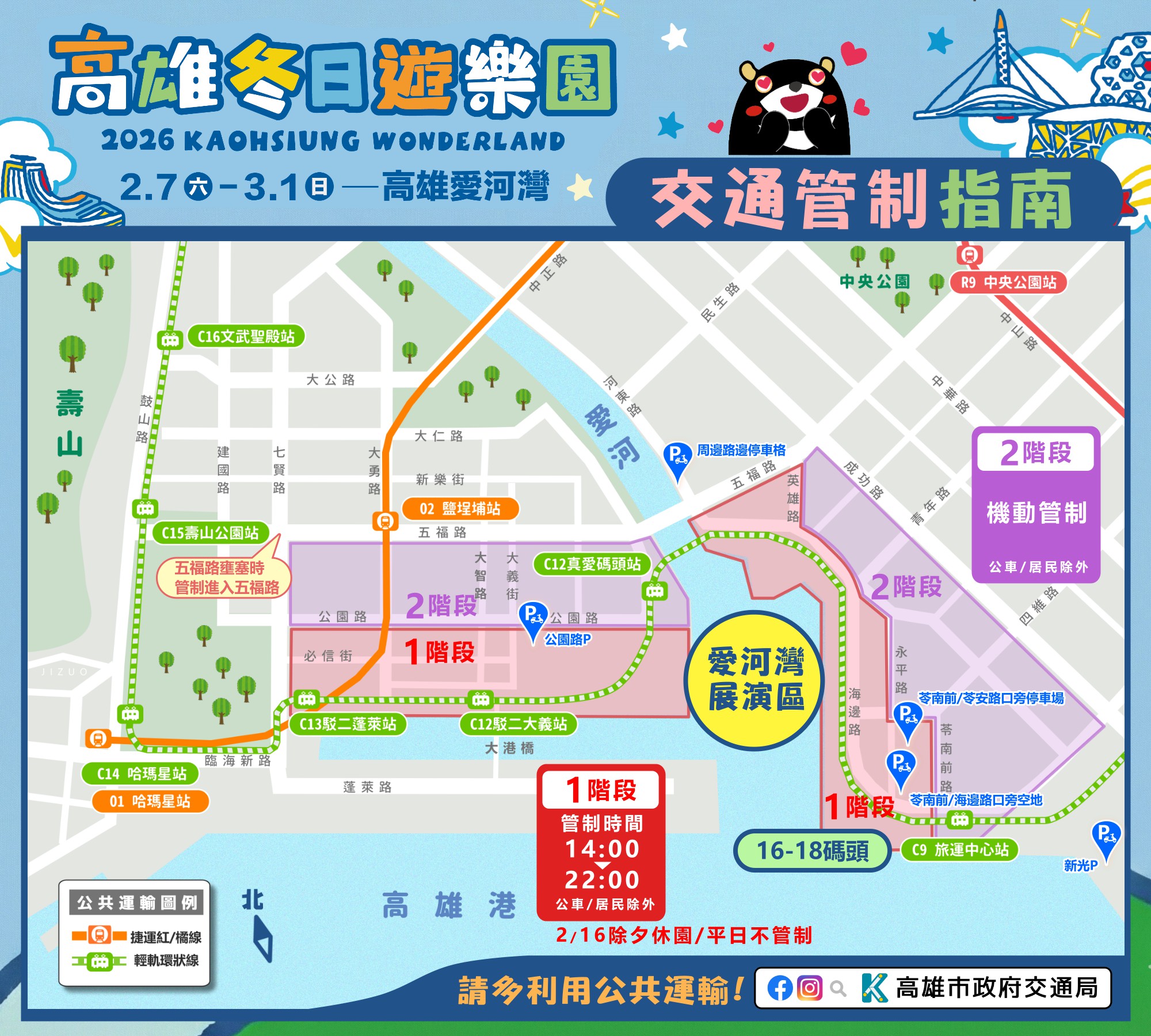 ↑圖說:高雄冬日遊樂園活動期間之春節連假(除2/16除夕外)及例假日,愛河灣周邊將分階段實施管制。(圖片來源:高雄市交通局提供)