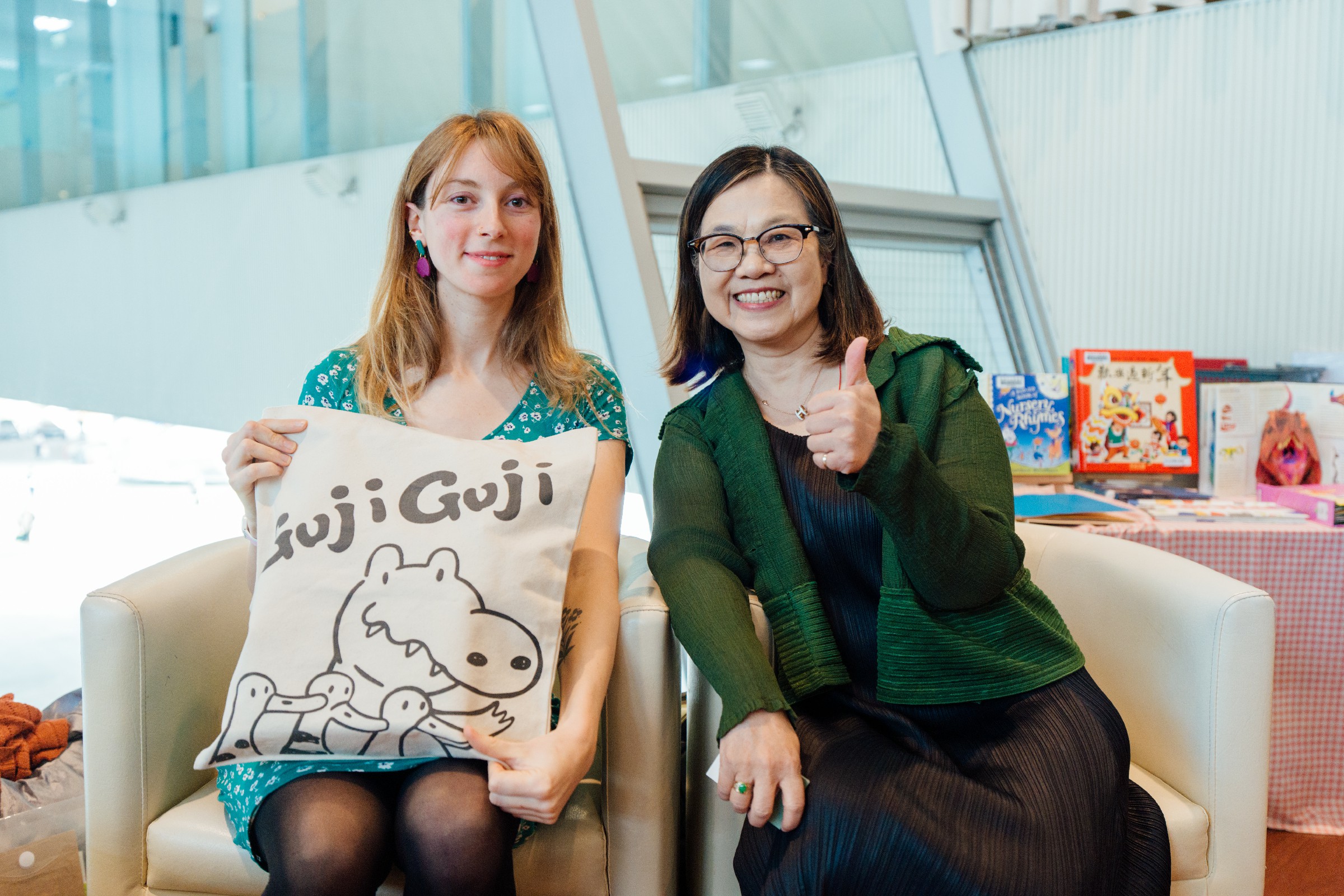 ↑圖說:高雄市立圖書館館長李金鴦(左)特別贈送高市圖形象禮品予諾依慕‧菲法赫(Noémie Favart),以表達誠摯的敬意。(圖片來源:高雄市立圖書館提供)