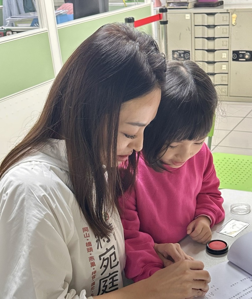 ↑圖說:高雄市議員黨內初選登記日,蔣宛庭與女兒一同完成登記相關程序,以母親身分走入公共參與現場,展現對家庭與育兒議題的實際關懷。(圖片來源:蔣宛庭競選辦公室提供)
