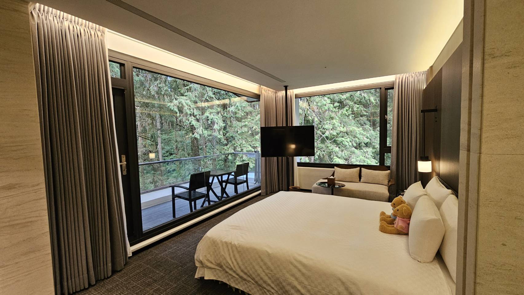 ↑圖說:阿里山賓館頂級客房採自然光灑落的落地窗設計,迎向遼闊無邊的森林、雲霧,彷彿把阿里山直接收入眼底。(圖片來源:記者 賴君欣 拍攝)