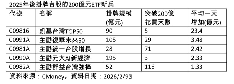 台股強強滾,也讓2025年以來掛牌的台股ETF新兵,規模快速成長,檢視規模站上200億元的5檔,其中有4檔鎖定台股市場,包括凱基台灣TOP 50(009816)、主動復華未來50(00991A)、主動統一台股增長(00981A)、主動群益台灣強棒(00982A)。