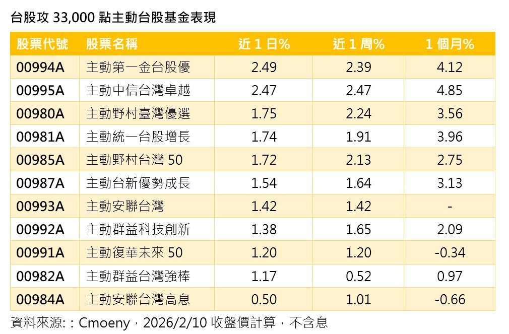 台股今天首度收在3萬3000點之上,改寫歷史新高,主動台股ETF也普遍搭上順風車,交出正報酬。其中,00994A主動第一金台股優、00995A主動中信台灣卓越,近一個月漲幅分別達4.12%及4.85%,領先其他同類型ETF。