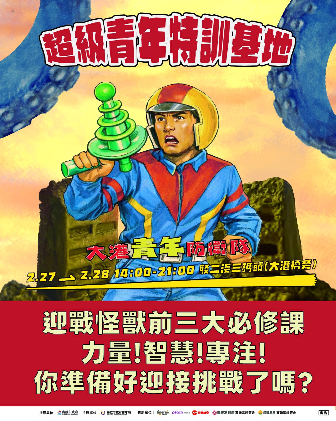 高雄市政府青年局再度揭開「大港青年防衛隊」神秘面紗,宣布將於2月27日至28日在駁二藝術特區淺三碼頭登場,響應「2026 Kaohsiung Wonderland 高雄冬日遊樂園」,以電影級場景打造「特攝微縮城市」與「超級青年特訓基地」,並推出總價值近40萬元的「OH!霸賞」抽獎活動,最大獎為12套高雄往返日本機票,邀請全台民眾走進港灣,化身守護城市的英雄。