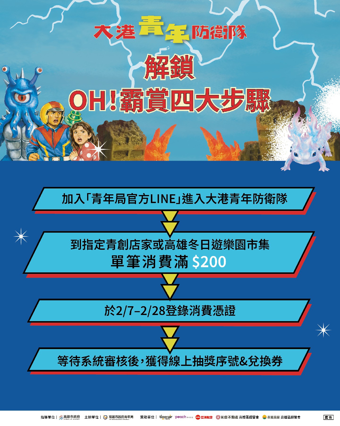 備受矚目的「OH!霸賞」抽獎活動已率先開跑。即日起至2月28日止,民眾於指定青創店家單筆消費滿200元,加入青年局官方LINE帳號並登錄發票,即可獲得專屬「英雄序號」參與抽獎。獎項包括台灣虎航、樂桃航空與AirAsia亞洲航空提供的12套高雄—日本來回機票。活動期間將進行現場即時抽獎,送出機票、智慧家電與超人力霸王限定周邊,活動結束後另有線上加碼抽,提升中獎機會。