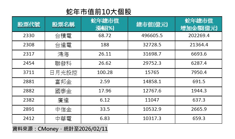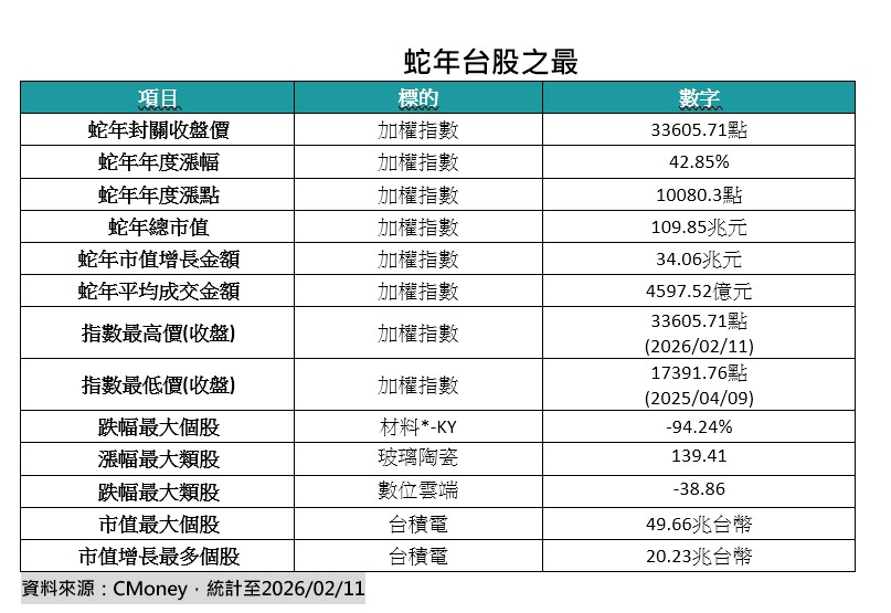 回顧金蛇年表現,台股累計上漲1萬零80點,漲幅42.8%,超越龍年的30%漲幅;台股總市值也由龍年封關的75兆5313億元,成長至約109兆5367億餘元,大增34兆54億元,增幅45%。
