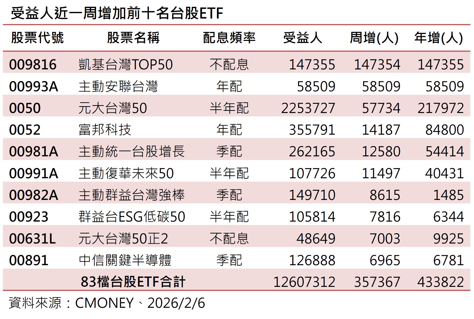 根據集保戶股權分散2月6日最新統計資料顯示,台股ETF總檔數來到83檔,受益人數周增35萬7367人,總人數來到1260萬7312人,連續3周創新高,統計今年來已增加43萬3822人。