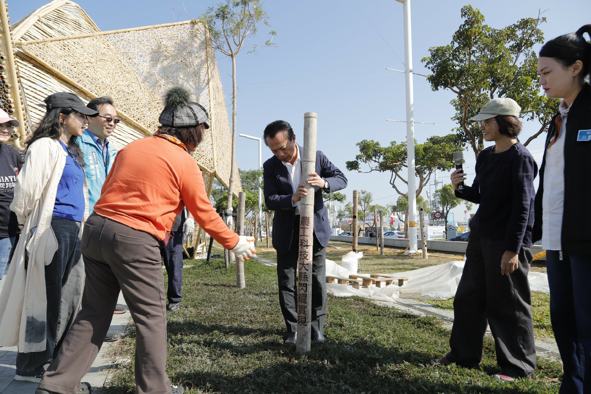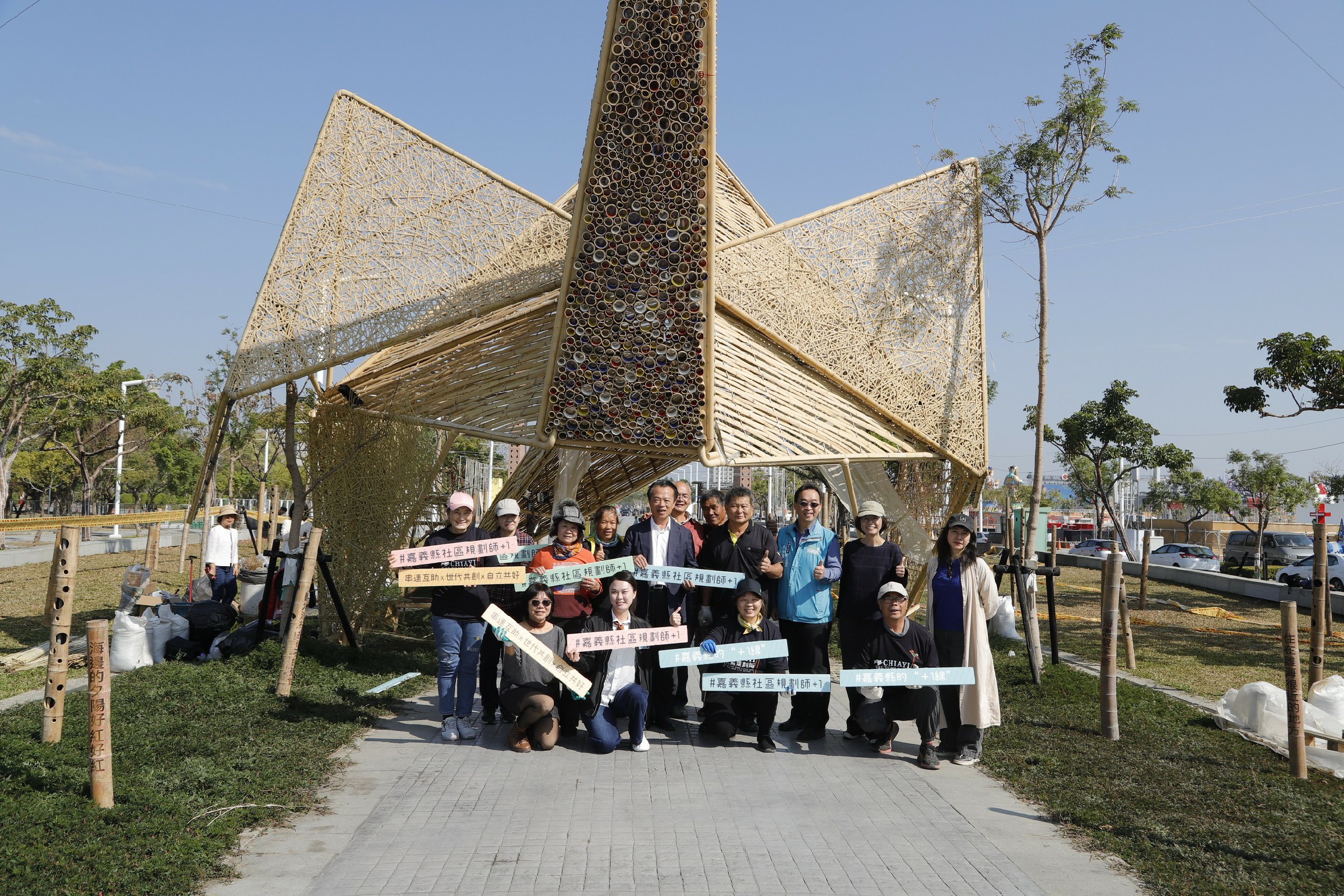 翁章梁首先走訪社規師燈區,在藍腹鷴主題燈組前,親自安裝一支刻有社規師共創詩句的竹筒燈,象徵點亮地方協作成果。燈區由許芳瑜老師導覽說明,整體規劃分為「藍腹鷴故事劇場」及「客家工藝—嵐賦閑手作區」兩大區域,邀集來自嘉義山區、海區與平原地帶的社規師共同參與,並由溪口鄉天赦竹編協會指導燈組外覆竹編工法,透過光影與編織工藝交織,將多年深耕社區的成果轉化為公共藝術展演。