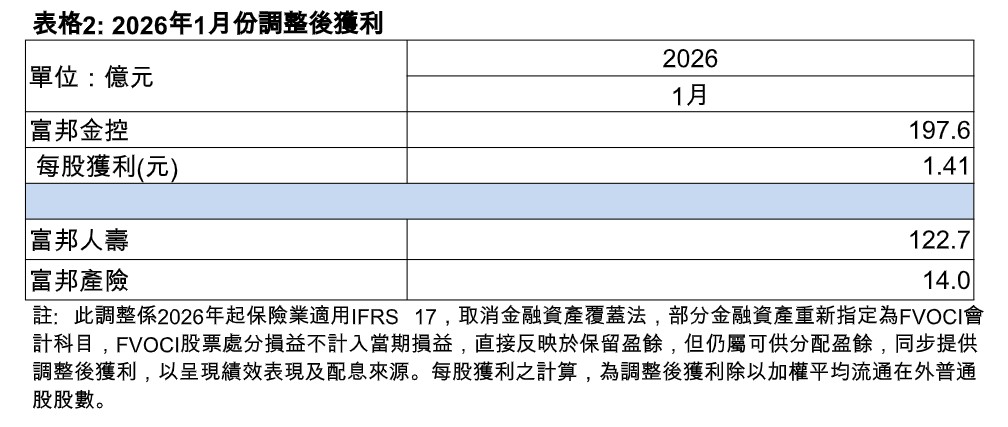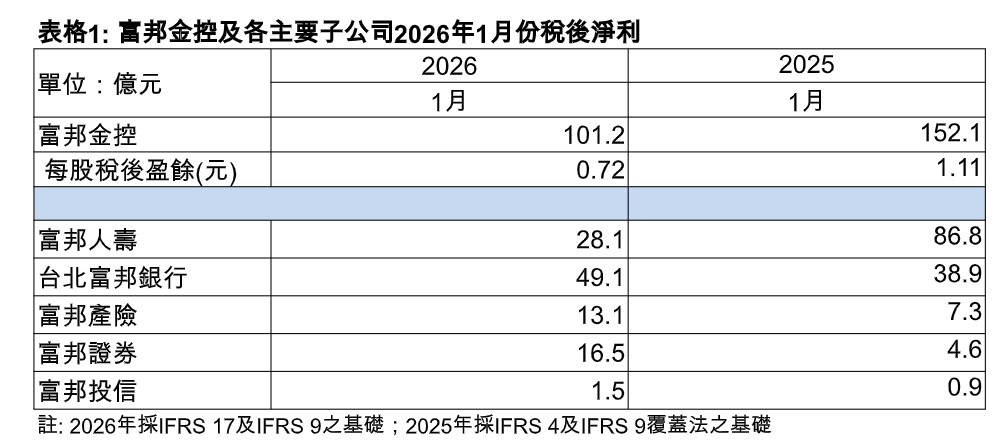 富邦金控今天公布2026年1月自結合併稅前淨利131.7億元、稅後淨利101.2億元,每股稅後盈餘(EPS)為0.72元。若加計透過其他綜合損益按公允價值衡量(FVOCI)之股票處分損益,1月調整後獲利197.6億元,調整後每股獲利為1.41元。