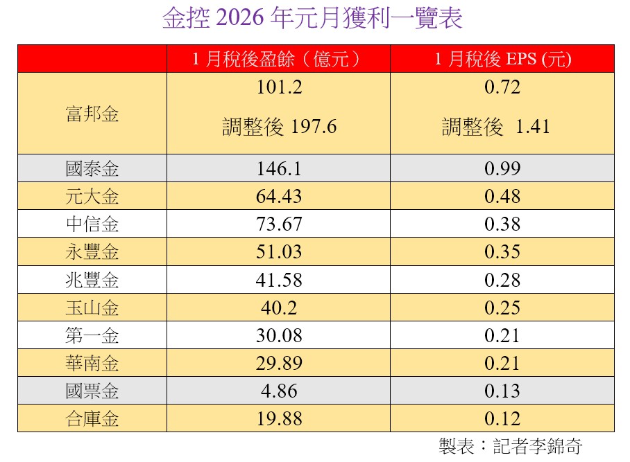 金控2026年1月獲利陸續出爐,其中,國泰金自結1月稅後淨利146.1億元,EPS 0.99元,追平去年同月。旗下子公司國泰世華銀行、國泰證券及國泰投信,單月稅後淨利皆創下同期新高。