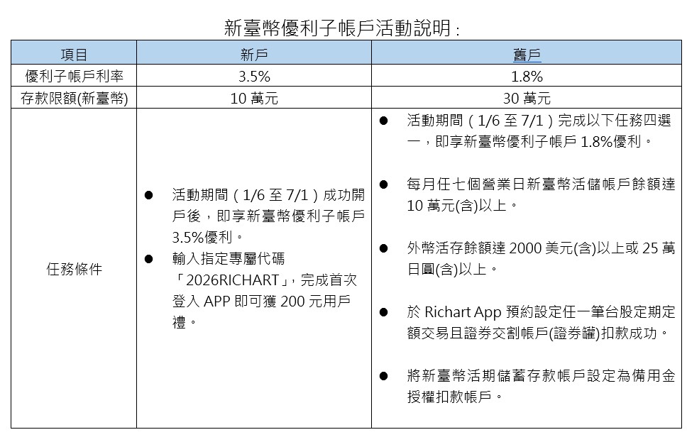 台新銀行邀請民眾把握2026年每一個資產增值契機,即刻開立台新Richart帳戶,並於開戶流程中輸入專屬代碼「2026RICHART」,完成首次登入APP即可獲得200元用戶禮。