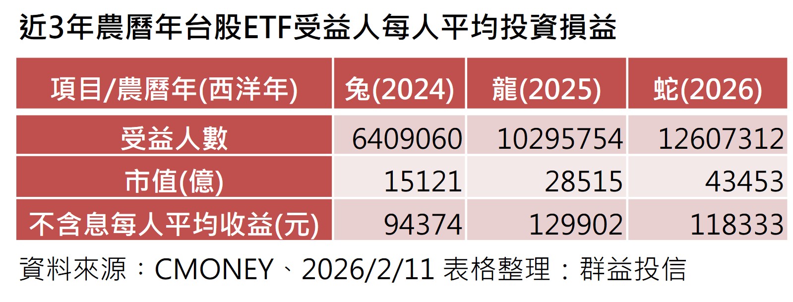 台股ETF投資持續發熱,統計金蛇年總檔數來到83檔,其中包括11檔主動式台股ETF,83檔整體總受益人數也來到1260萬7312人,連帶市值成長到4.34兆,若不含配息所得計算,平均每位投資人在蛇年賺逾11.83萬元。