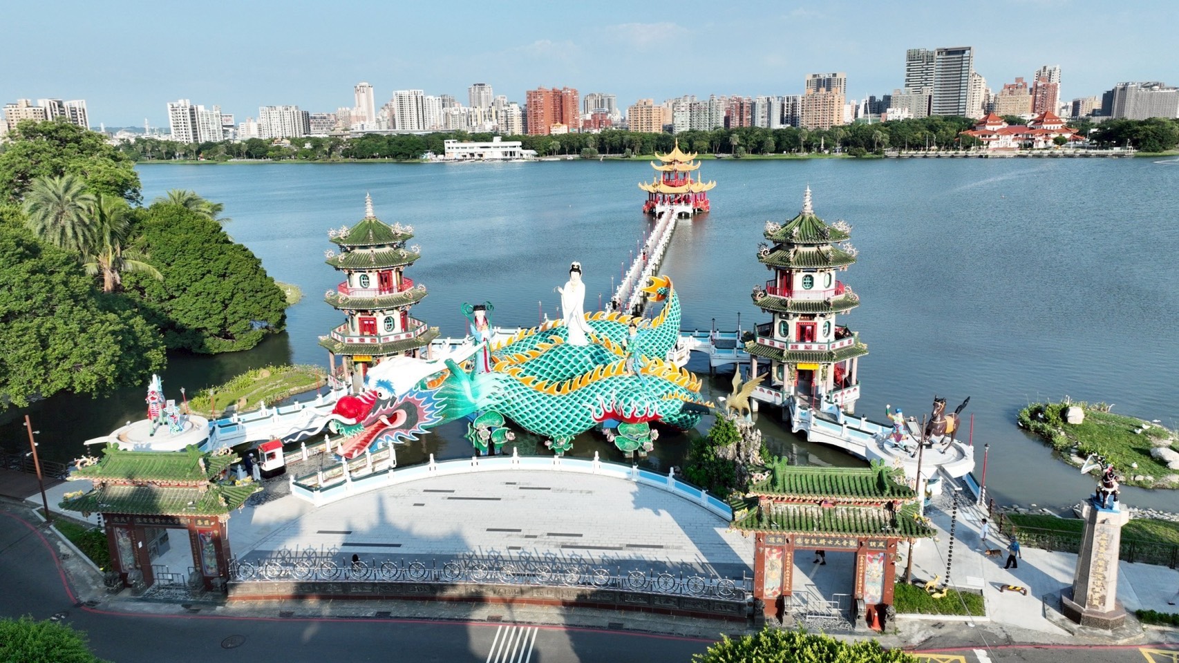 高雄市政府觀光局指出,整體工程自北向南推進,涵蓋孔廟廣場整建、親水護岸營造、兒童公園共融遊戲場與溜索設施建置,以及龍虎塔至春秋閣間步道景觀重塑等項目,同步改善公廁通風採光與周邊設施,全面提升遊憩品質。其中最受矚目的,為填平啟明堂前龜池斷點、改建為開放式休閒廣場,讓人行與自行車動線順暢銜接,不再繞行車道、與車爭道,成功解決多年交通瓶頸,打通環潭「最後一哩路」。