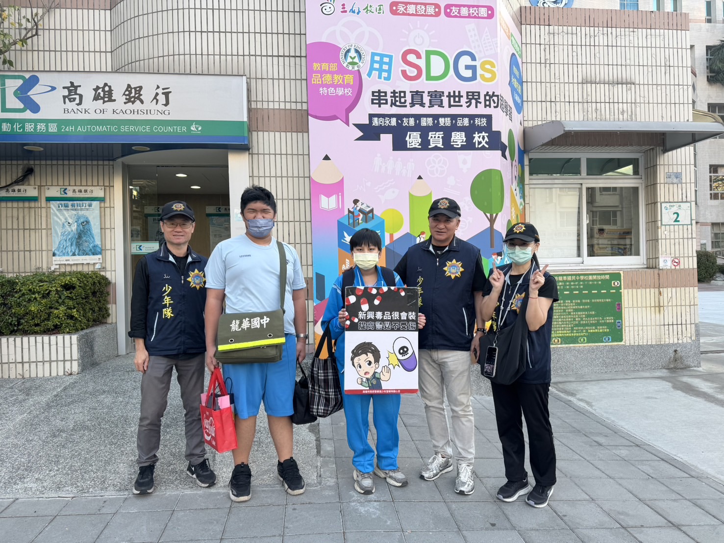 ↑圖說:高市警少年隊一早便在上學通道施行法治教育,避免學生誤被詐團利用成為車手。(圖片來源:高雄市警局少年隊提供)