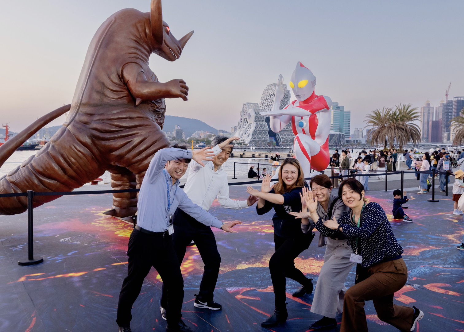 活動期間,高雄市府亦安排八王子市副市長植原康浩率團參訪愛河灣與碼頭樂園。面對15米高的初代超人水上裝置,貴賓們興奮模仿經典飛行姿勢並齊喊「シュワッチ」,現場笑聲不斷。觀光局更巧妙將捷運刷卡音效設計為超人發射光線的「シュワッチ」,諧音「洗襪子」成為春節期間廣為流傳的趣味梗,增添活動話題與親切感。