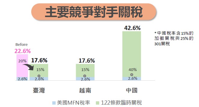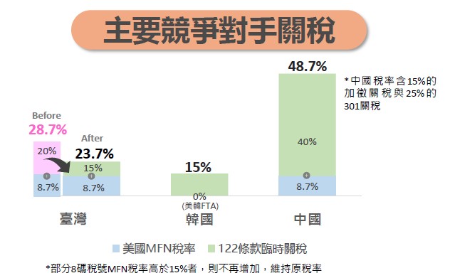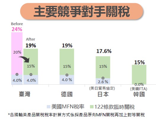 至於對個別產業影響,以工具機產業來說,經濟部研判122條款臨時關稅加徵後,我國與主要競爭對手國如德國稅率相同,惟與日本、韓國相比仍有關稅差距(約1.4%–4%)對我產業出口可能受影響。