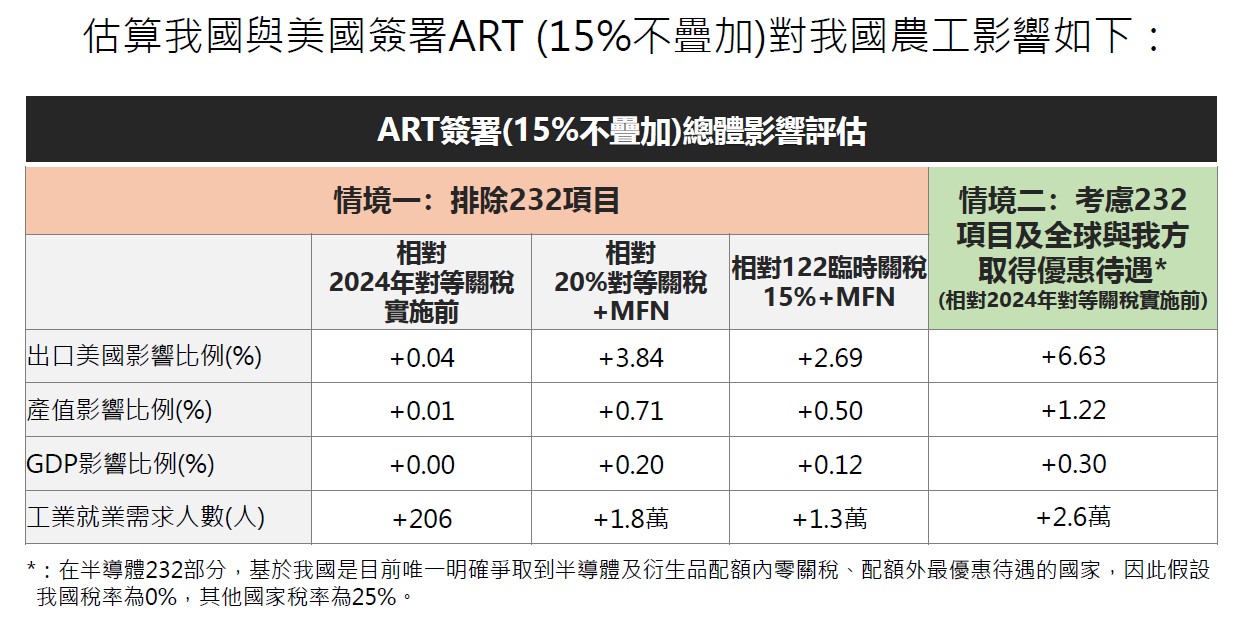 估算我國與美國簽署ART(15%不疊加)對我國農工影響如下: