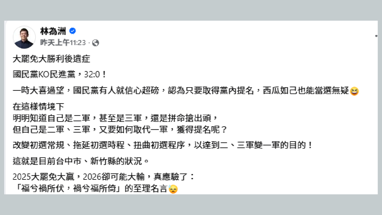 林為洲批評,KMT先前以32比0壓倒性KO民進黨,部分黨員因此信心爆棚,誤以為只要取得黨內提名便篤定當選。在此心態下,部分明知自己是二軍、三軍的人選仍強行搶出頭,更試圖透過「改變初選常規、拖延初選時程、扭曲初選程序」等手段,達到取代一軍的目的。他痛批此現象在台中市與新竹縣尤為明顯,憂心警告:「2025大罷免大贏,2026卻可能大輸」,並引用「福兮禍所伏,禍兮福所倚」點出危機所在。