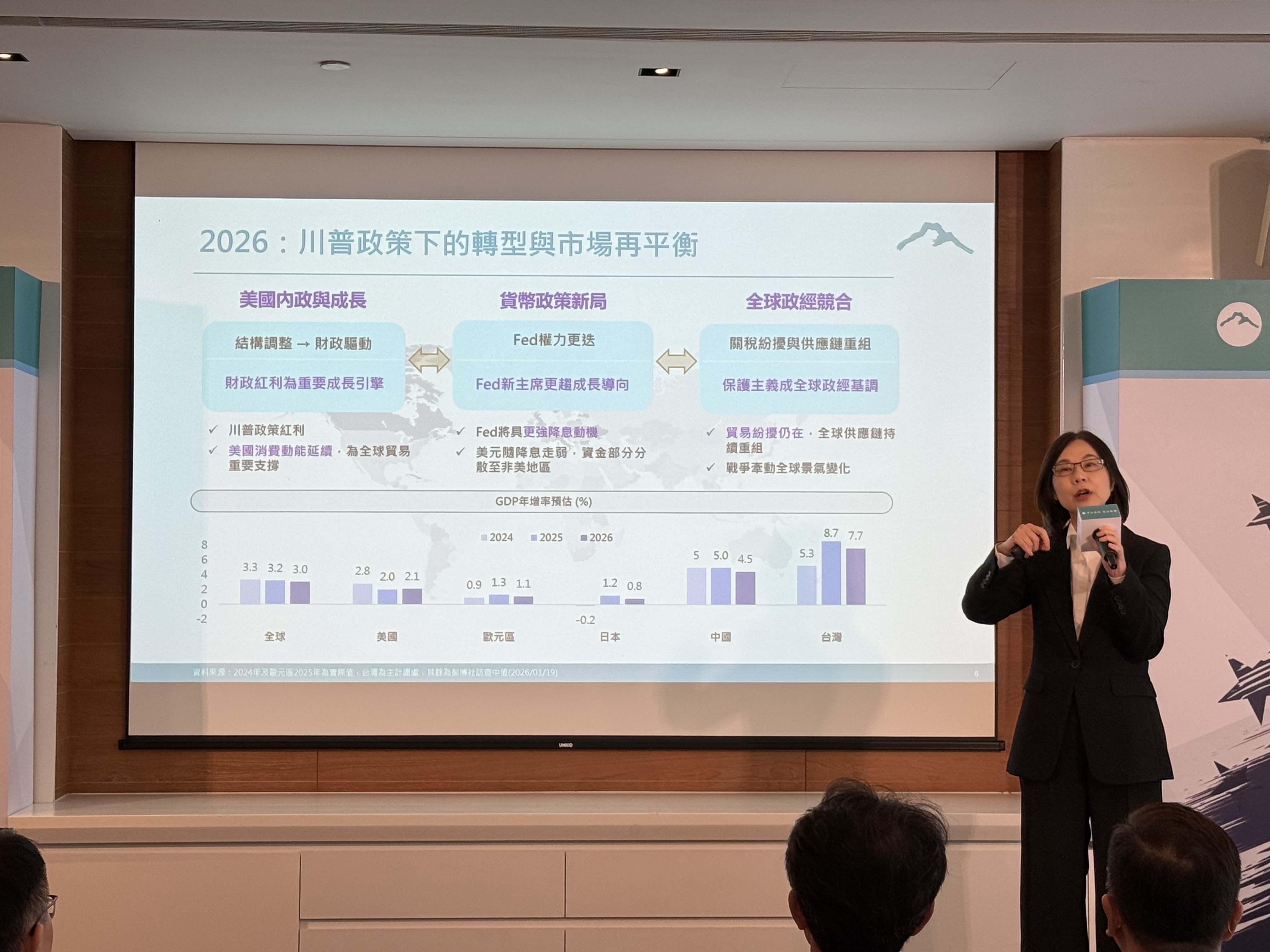 針對馬年全球市場趨勢,玉山投信投資長李孟霞(如下圖,記者李錦奇攝影)指出,2026年全球經濟在川普新一輪政策框架下邁入轉型階段,市場也從前兩年的快速修正逐步回到再平衡狀態。隨著美國財政刺激重新成為主要成長來源、供應鏈調整持續推動產業投資,美國消費力道仍為全球景氣的重要支柱,同時,聯準會在新任主席上任後,預期貨幣政策風格朝向「偏重趨勢」轉變,市場預期今年仍具降息動能,但長天期利率下行空間有限,使得整體利率曲線朝向正常化方向發展面。