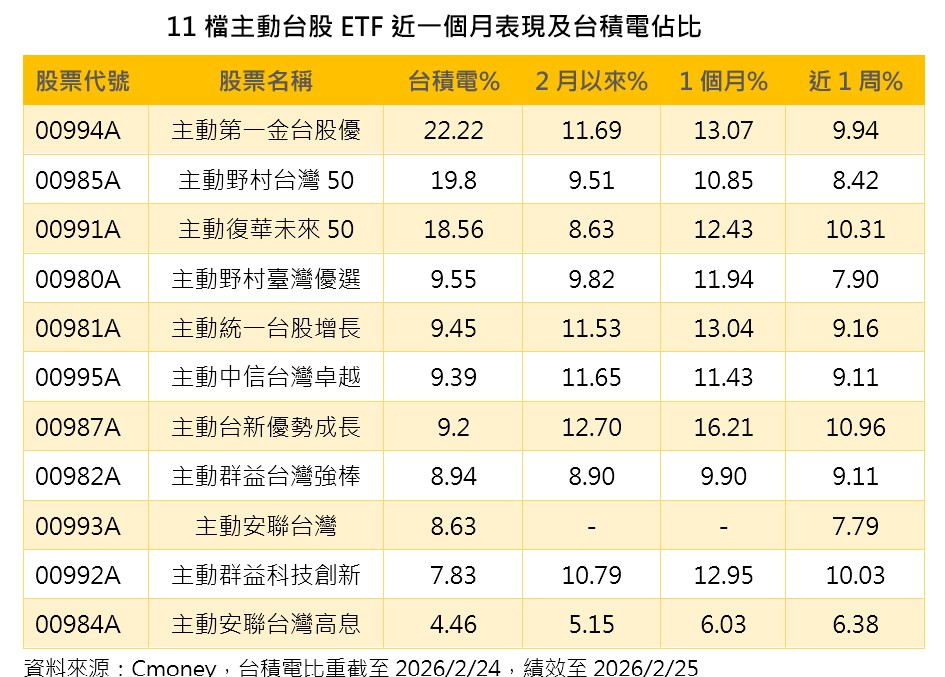 台積電持有比重超過9%的有主動野村臺灣優選、主動統一台股增長、主動中信台灣卓越,及主動台新優勢成長等,2月漲幅亦分別達9.82%、11.53%、11.65%,及12.7%。