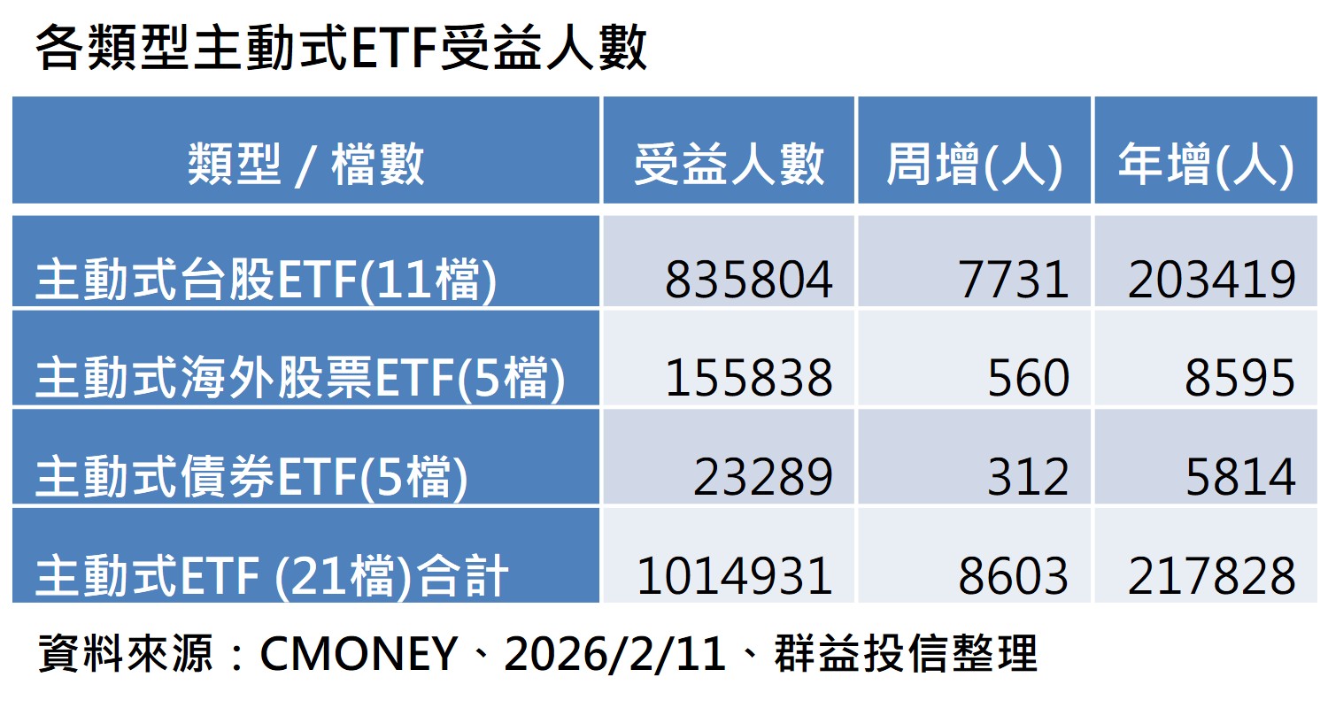 市場目前共有11檔主動式台股ETF、5檔主動式海外股票ETF、5檔主動式債券ETF,根據集保戶股權分散2月11日最新統計資料顯示,整體主動式ETF受益人數上周增加8603人,總人數來到101萬4931人,統計今年來已增加21萬7828人。
