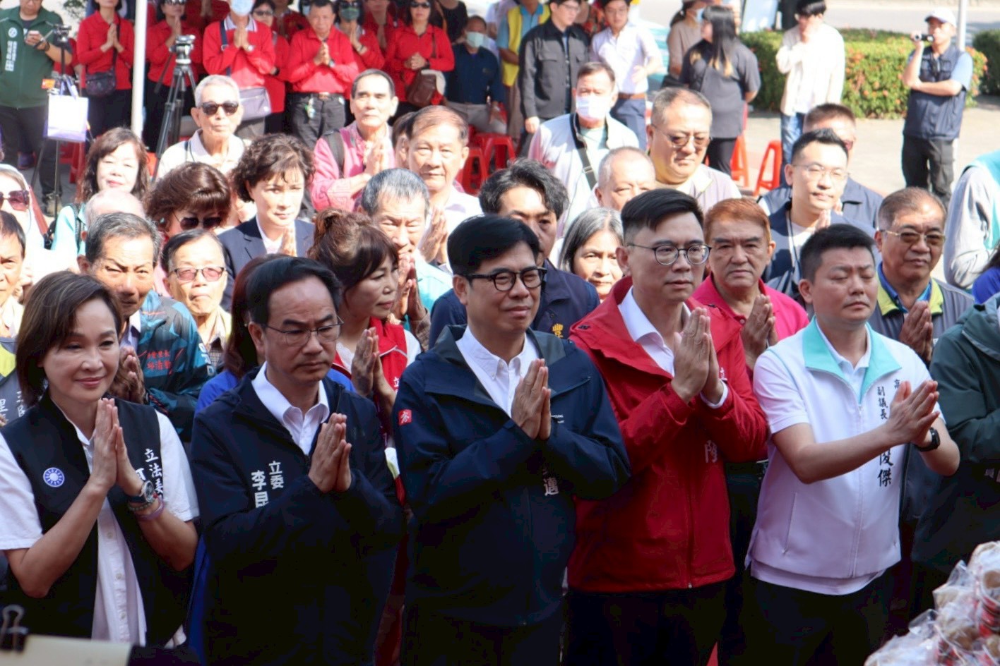 祭儀圓滿後,陳其邁率市府團隊與鄉親團拜並發放開運紅包,民眾排隊領取、爭相握手致意,場面熱烈。主辦單位同時準備象徵平安與祝福的客家粄食供民眾享用,在古禮與歌舞之外,以味蕾延續文化記憶,也為新的一年增添滿滿福氣。