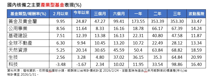 主要產業型基金部分,黃金貴金屬股票型基金2月以來平均漲幅9.95%,再度勇冠各類型基金;AI電力與基礎建設需求帶動下,公用事業基金、基礎建設產業型基金,分別上漲8.56%與7.51%,表現同樣亮眼。