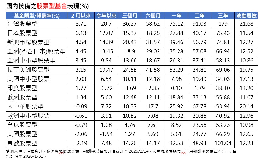 高市早苗領軍自民黨在國會改選大勝,日股大漲,日股基金2月平均上漲6.13%;新興市場股票型基金則受惠商品行情,漲幅達4.54%。