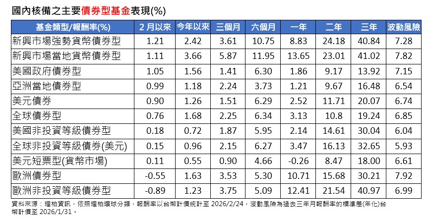 相對地,美國股票型基金受到科技股修正影響,加上川普新關稅、美伊地緣局勢等變數回檔,全月下跌2.06%,表現落後。