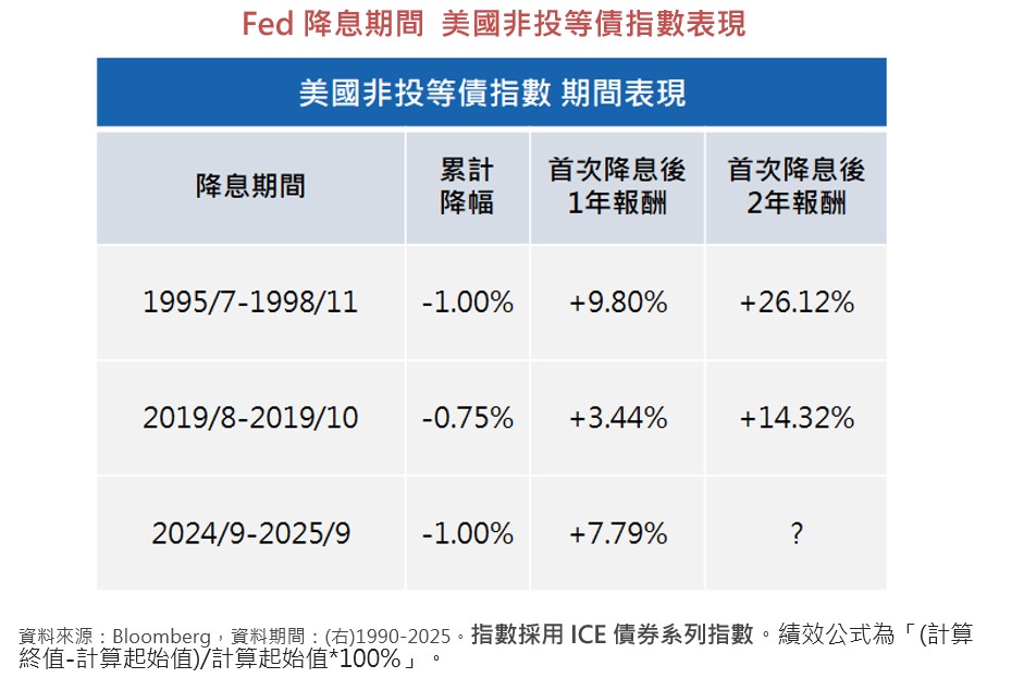 該研究團隊指出,美國企業資產負債表保持健康,能支應資本支出加速成長 ,且企業債務償還能力仍維持在歷史較高的水準,整體違約風險較低。另外,統計過去4次Fed降息周期,其中,預防型降息為1995年及2019年,降息啟動後兩年,美國非投資等級債分別上漲26.12%、14.32%。