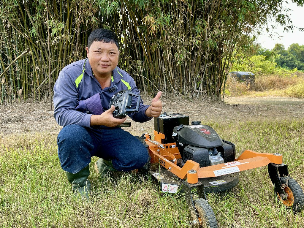 ↑圖說:大社區行農生產合作社盧定楠導入遙控式割草機。(圖片來源:高雄市農業局提供)