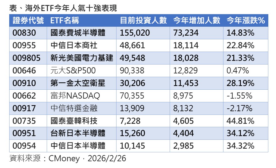部分海外ETF無懼戰火升溫,今天逆勢上揚,像是第一金太空衛星(00910)收盤上漲2.3%,累計今年前2月漲幅達28.1%。