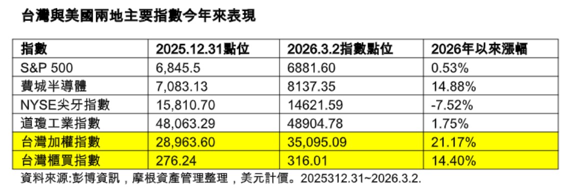 沈馨表示,根據彭博資訊統計,台股今年來截至2日為止,已上漲21.17%,就連櫃買指數也上漲14.4%,但美國道瓊工業指數僅上漲1.75%、S&P 500指數也僅上漲0.53%,可見台北兩地股市今年表現大不相同。