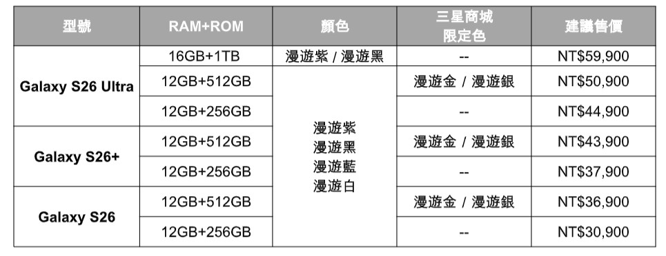 三星今日宣布Galaxy S26旗艦系列正式上市,共推出Galaxy S26 Ultra、Galaxy S26+、Galaxy S26三款機種,分別有12GB+256GB、12GB+512GB兩種容量版本,建議售價3萬900元起跳;Galaxy S26 Ultra另有16GB+1TB的頂規容量,建議售價5萬9900元。