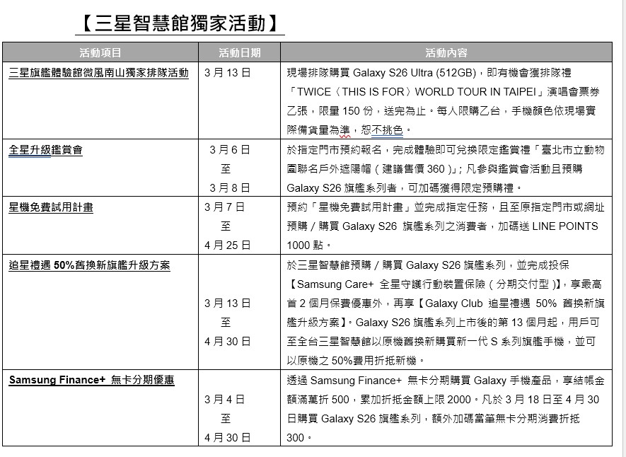 台灣大哥大今天也宣布,即日起至3月11日開放預購全新Samsung Galaxy S26旗艦系列,加碼回饋星粉,預購享256GB容量升級512GB,還可於3月13至17日期間優先取機。