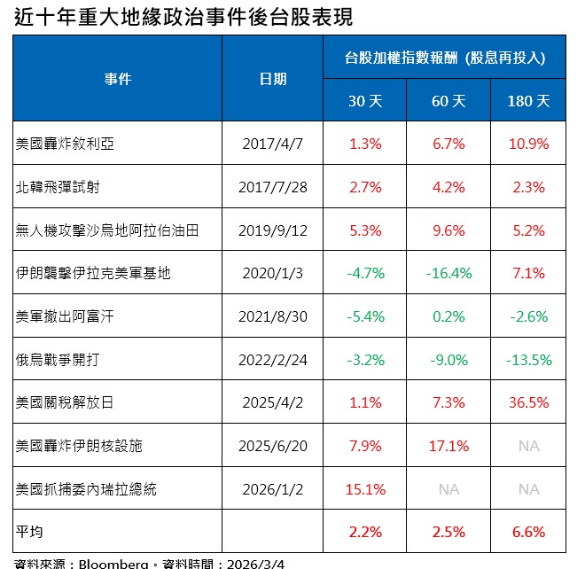 受到中東情勢緊張影響,台股昨天重挫1494點,跌幅4.3%,外資賣超台股966億元,創史上單日第二大賣超紀錄,重挫投資人信心。不過,法人統計過去10年的重大地緣政治事件及台股後續表現,地緣政治衝突雖然在短期內造成恐慌,但事後回顧,似乎都是給予漲多市場一個適度修正的「理由」,而非改變產業基本面的「終點」。