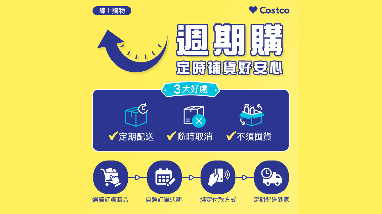 在操作流程方面,會員只要登入好市多線上購物平台,挑選適用週期購的商品,接著設定配送週期並綁定付款方式,即可完成訂閱。之後商品將依照設定的時間定期配送到府,若有需要,會員也能隨時調整配送頻率,或在下一次出貨前取消訂閱。