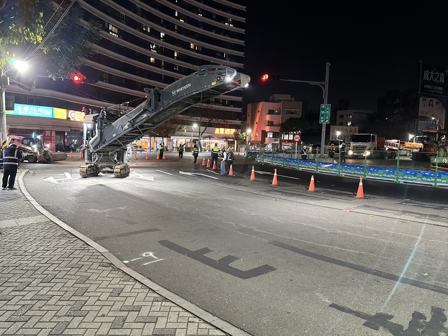 圖說:施工團隊利用夜間時段進行道路刨鋪與工程作業,加速完成站前交通改善工程。(圖片來源/台南市交通局)