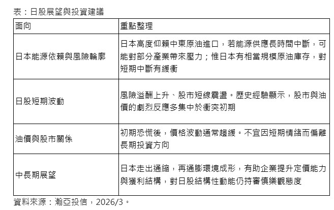 日股昨天反彈2.88%,舒緩近期因中東戰事升溫,導致日股拉回的壓力。法人認為,日本高度仰賴中東原油進口,若能源供應出現長時間中斷,確實可能對部分產業帶來壓力,不過,日本無論在公部門或民間部門,皆維持相當規模的原油庫存,對於短期供應中斷具備一定緩衝能力。