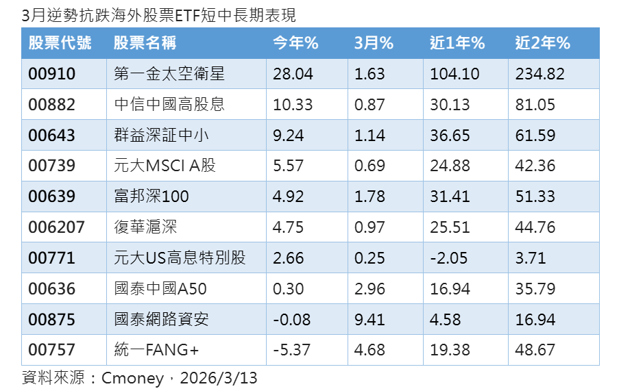 3月逆勢抗跌海外ETF一表掌握 太空衛星、陸股、科技主題為主