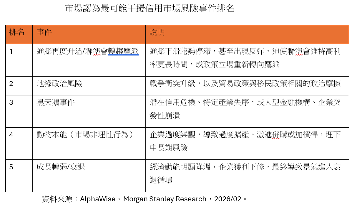 外資報告指出,市場認為最可能干擾信用風險的因素仍是通膨與聯準會政策,而非經濟衰退或信用事件。不過,各項風險評分差距不大,顯示投資人對未來風險缺乏高度共識,也因此解釋了信用市場目前呈現區間震盪、以利差操作為主的投資行為。