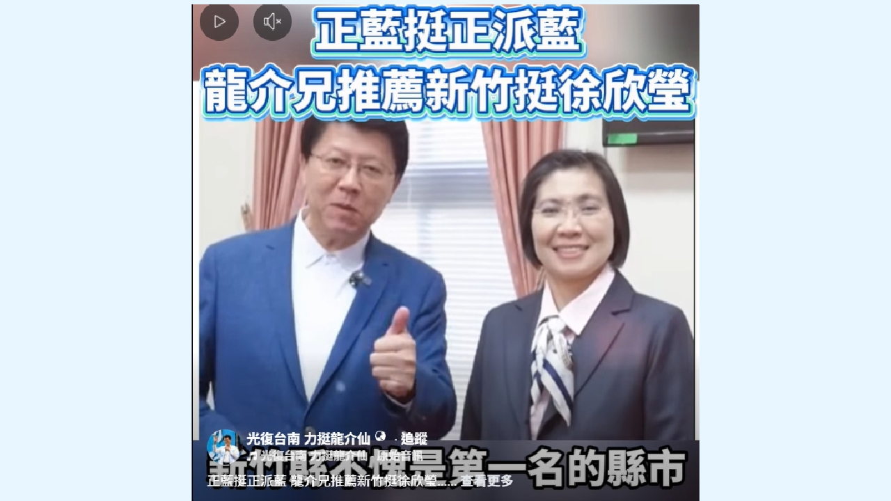 ↑圖說:立委謝龍介也在臉書發布力挺影片,以「正藍挺正派藍」為訴求,強調徐欣瑩在國會表現亮眼,長期為新竹爭取資源、推動地方建設。(圖片來源:翻攝自謝龍介臉書)
