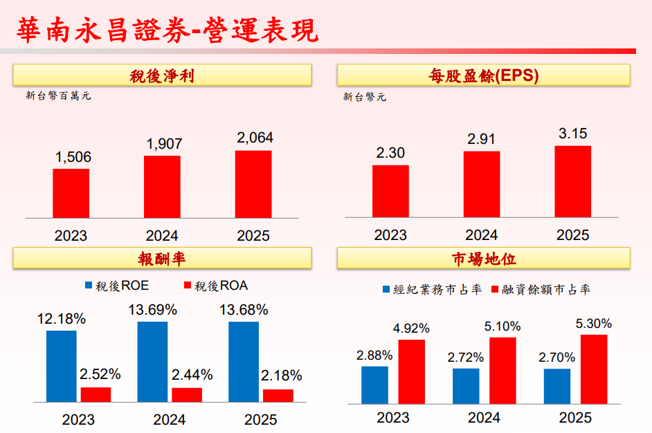 華南永昌證券去(2025)年在自營與債券業務成長帶動下,稅後淨利20.64億元,年成長8.2%,EPS自結3.15元,居公股券商之冠。