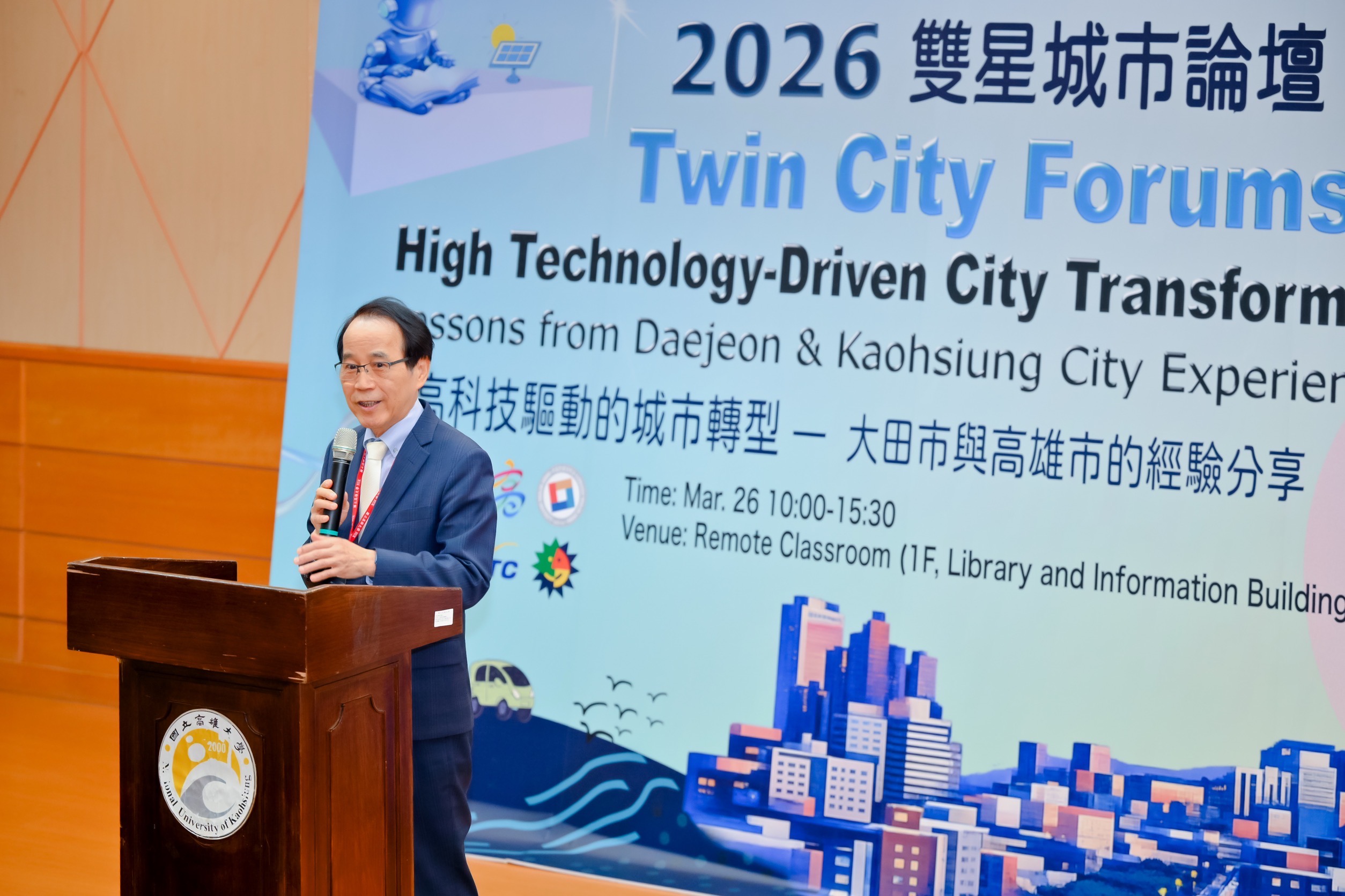 高雄持續深化與韓國友好城市交流合作,國立高雄大學與高雄市政府26日共同主辦「雙星城市論壇:高科技驅動的城市轉型—大田市與高雄市的經驗分享」,邀集友好城市韓國大田廣域市、國立韓巴大學及台灣高雄市相關領域專家學者,產官學界聚焦智慧城市推動、半導體與高科技產業發展、人才培育、產學研合作及淨零永續等重要議題,透過專題分享及綜合座談,交流兩座城市在產業升級與城市轉型上的經驗與願景。