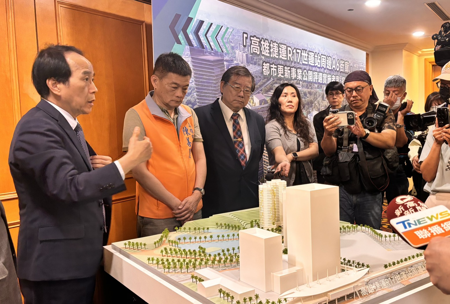 ↑圖說:林欽榮介紹R17世運站東側A6街廓公辦都市更新基地模型。(圖片來源:高雄市都發局提供)