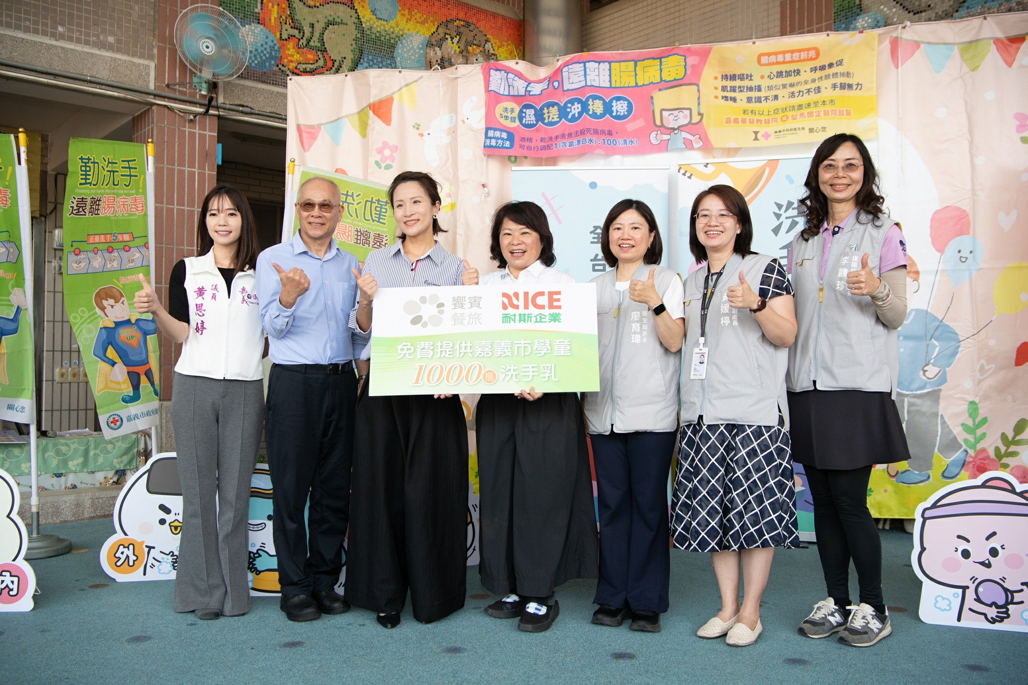 因應腸病毒流行季即將到來,饗賓集團與耐斯企業27日攜手捐贈1,000瓶洗手乳予嘉義市幼兒園,由黃敏惠市長代表受贈,並與學童現場示範正確洗手步驟,透過物資挹注與衛教推廣雙軌並進,提升校園防疫量能。