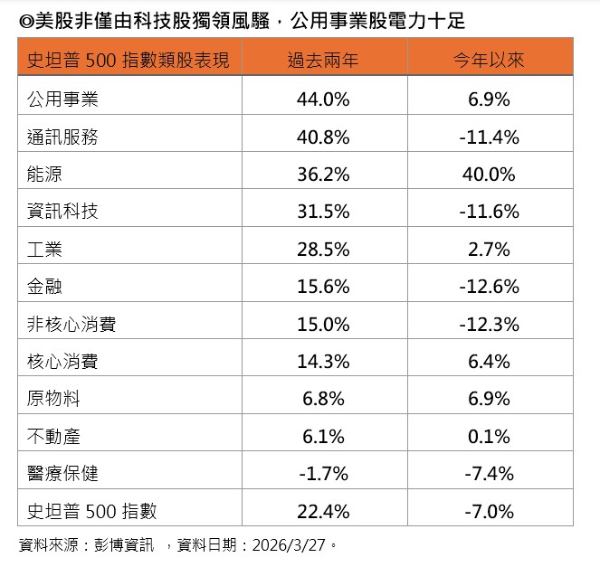 中東緊張情勢拖累美股今年以來表現,但法人觀察史坦普500指數的11大類股表現,除了能源、原物料類股受惠油價與商品表現強勢,公用事業因擁有電力需求與實質資產雙重優勢而勝出,也成為近期抗跌類股,且過去2年也在類股輪動趨勢下成為美股領頭羊。